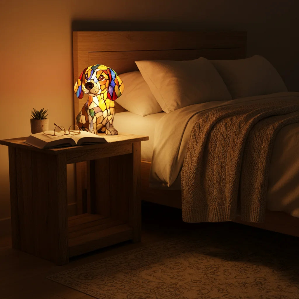 Adoptez un compagnon lumineux qui ne demande qu'à égayer vos soirées. Son design unique en vitrail capture l'âme d'un chien, apportant chaleur et personnalité à votre espace. Une présence réconfortante, sans les poils!